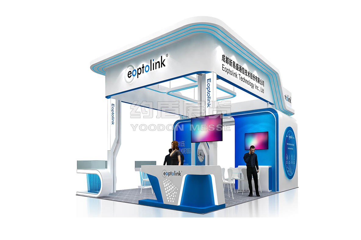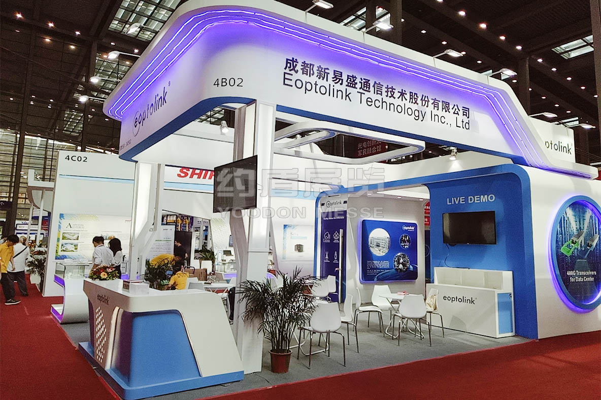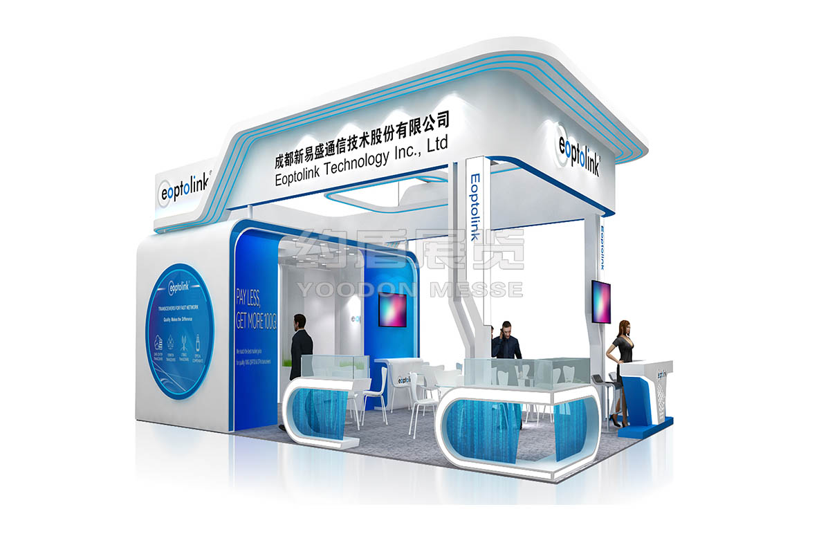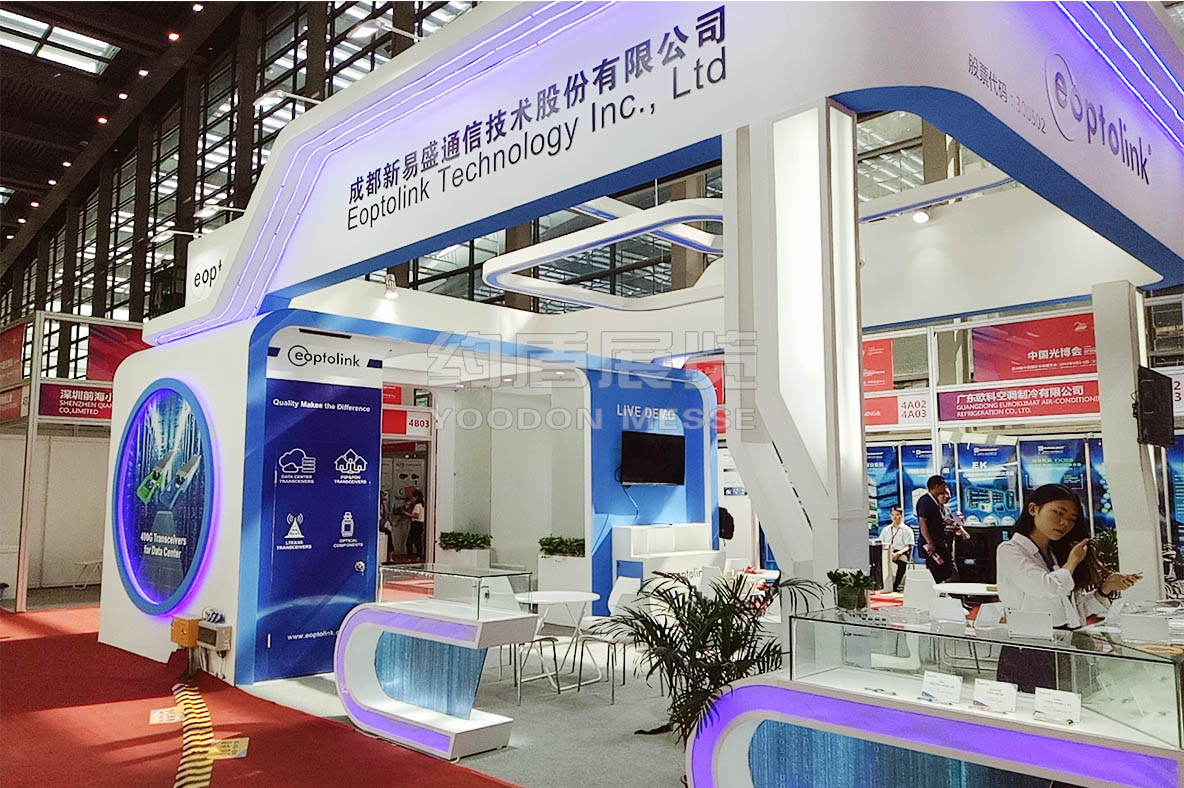 新易盛展臺(tái)設(shè)計(jì)搭建的風(fēng)格主題是藍(lán)色,通信電子展臺(tái)設(shè)計(jì)搭建的主題色,新易盛展臺(tái)主要推出了公司最新技術(shù),向全世界展示。